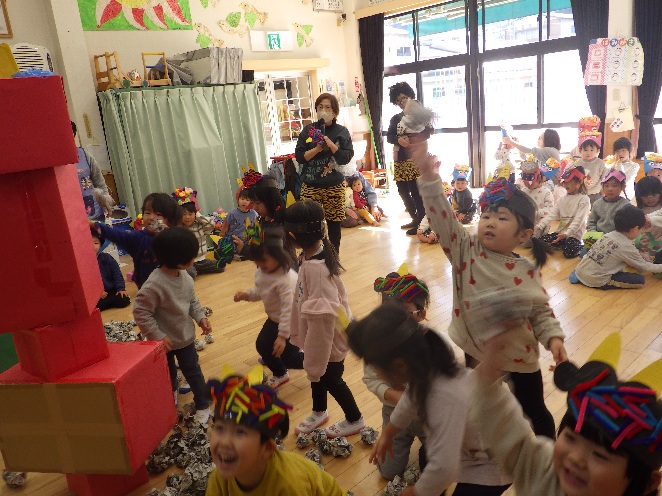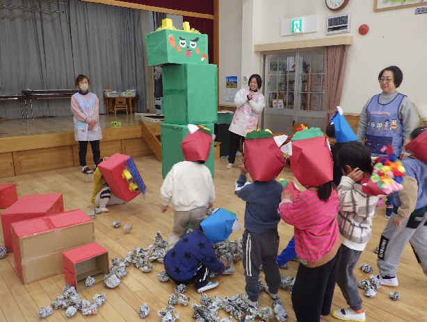みんなで新聞の玉を、赤オニ・青オニ・緑オニにぶつけて、倒すのに必死の子どもたちでした♪